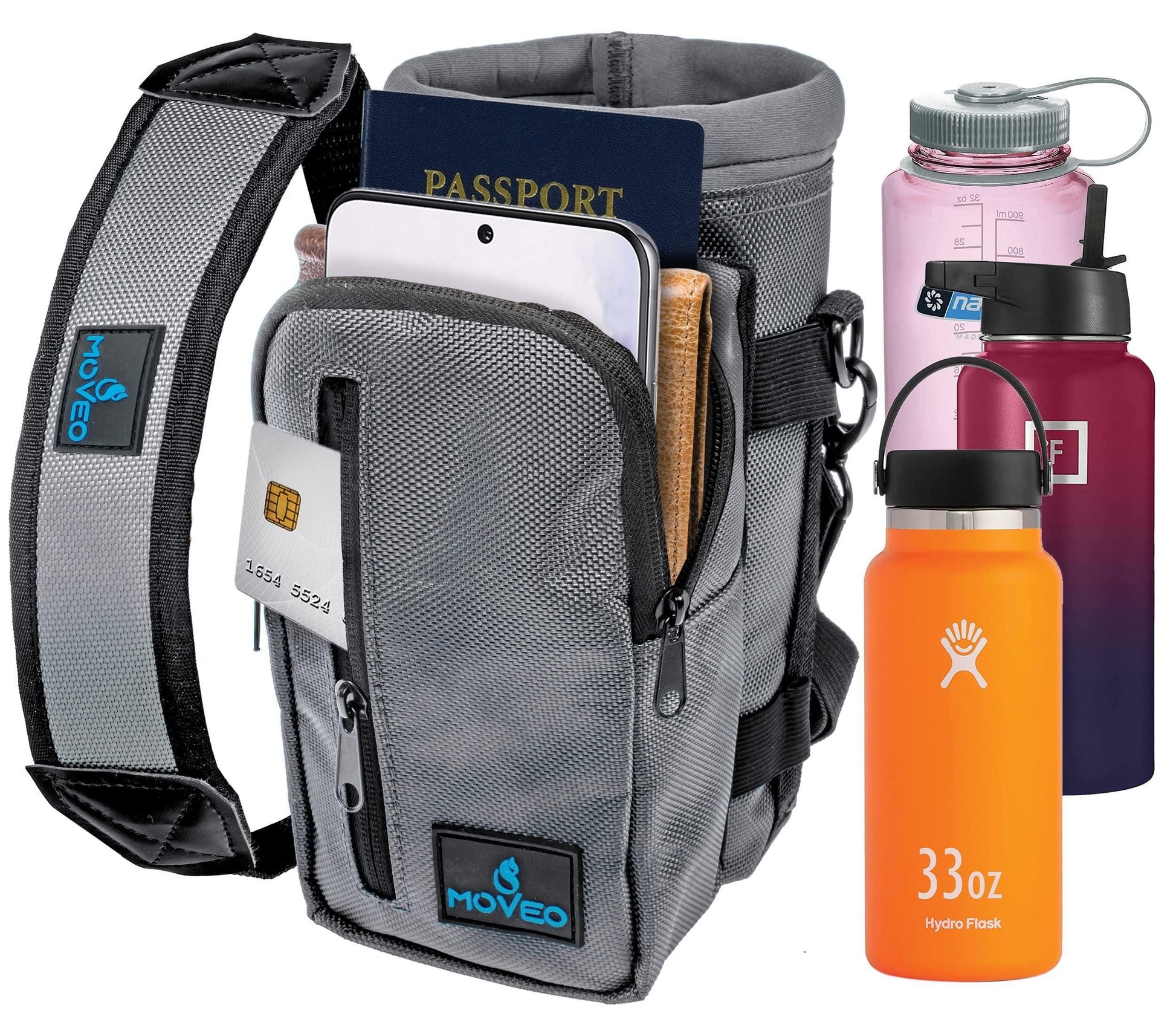 4.two front pockets for extra storage large polyester, water-resistant zippered pocket/pouch fits iphone plus, any smartphone up to 6.5 inches, your wallet, keys, etc. the small zippered pocket for storage holds credit cards, id, and other essentials - perfect water bottle carrier for walking, hiking, camping, gym, or travel. wear it as a small water sling, like a kavu-style water bottle bag crossbody for men and women
