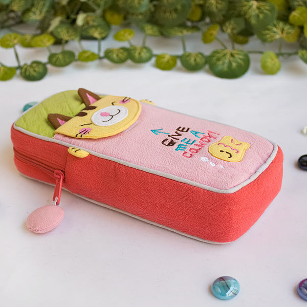 [Candy Cat] Embroidered Applique Pencil Pouch Bag / Cosmetic Bag / Carrying Case (3.1*7.8*1.6)
