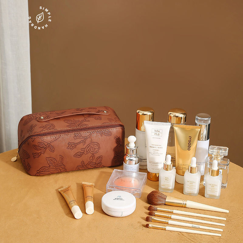 Wholesale Embossed flower pattern leather bag makeup cosmetic bag