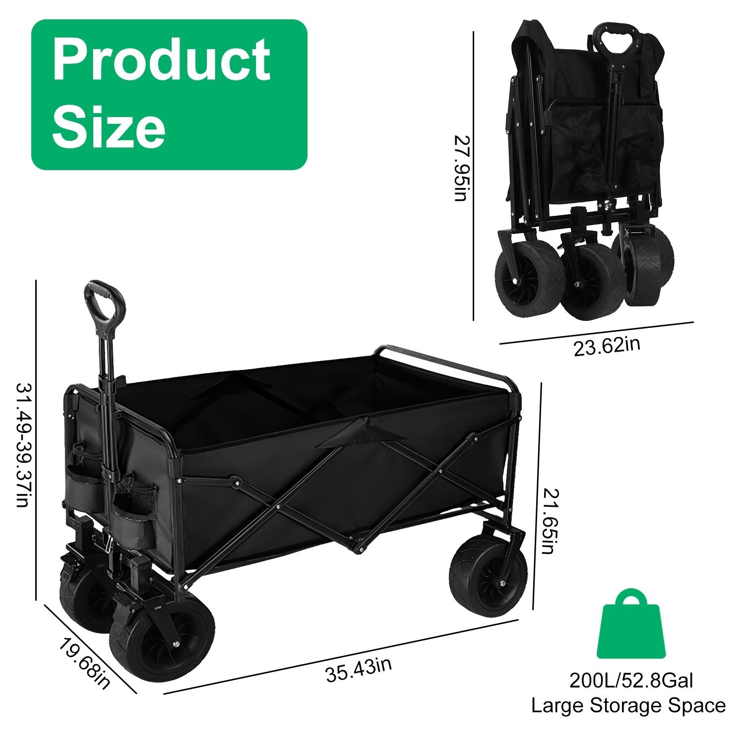 *200L Large Capacity Wagon*:With the maximum unfold size of 35.43x19.68x39.37in,our collapsible wagon cart provides an enlarged and deepen 200L/52.8Gallon storage space to hold all your outdoor essentials. Additionally,2 added mesh pockets can be used to place umbrella,drinks,bottles and more. An ideal helper for effortlessly outdoor camping transportation.