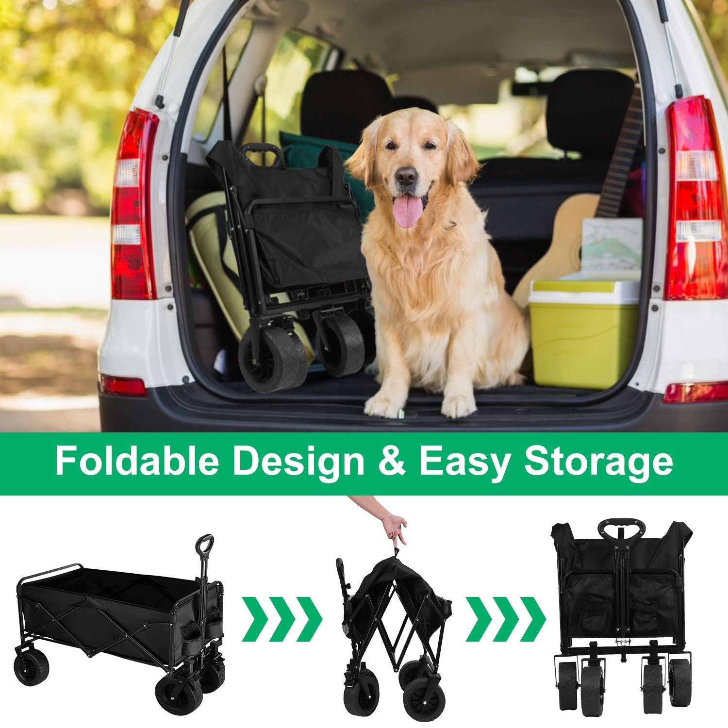 *Quick Fold & Easy Storage*:No laborious assembly is required. Our collapsible wagon cart is ready to use once you receive it. Simply pull the strap on the bottom to fold it. With the folding dimension of 23.62x27.95in,this foldable utility wagon cart can be conveniently stored in most car trunks when not in use.