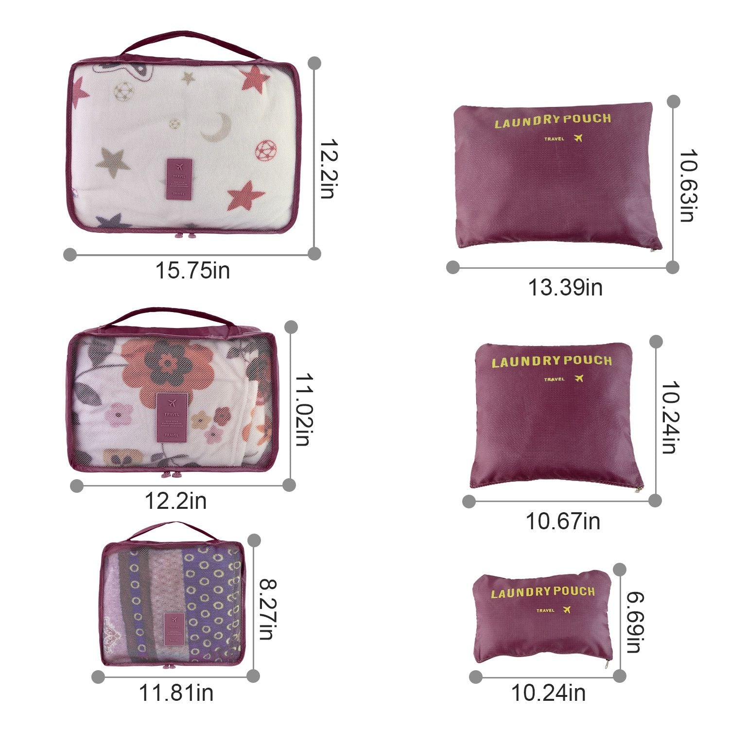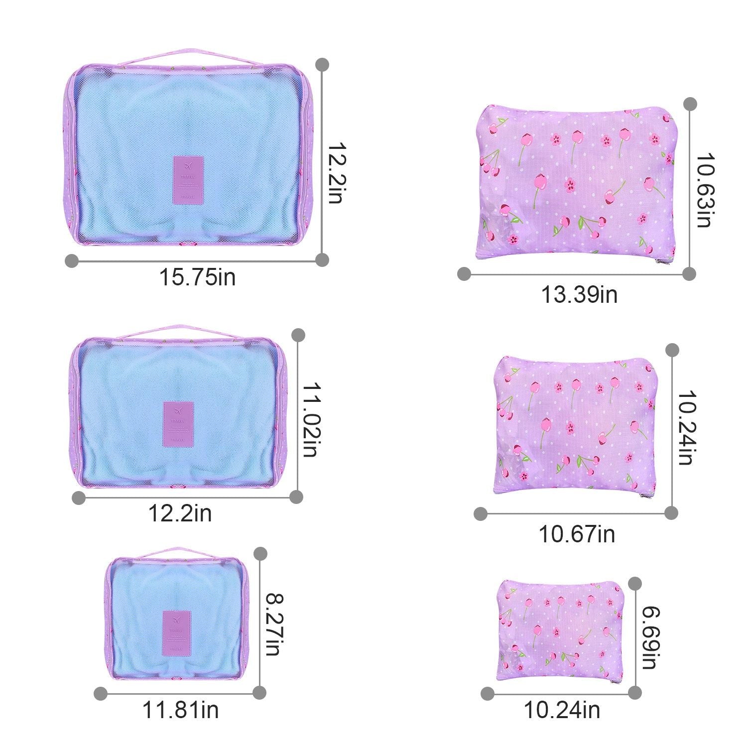 **9 Pcs Mix Set*:3 Packing Cube- Large(15.7 x 11.8 x 5.1 inches) and Medium(11.8'x11.0'x5.1' inches) and Small(7.9 x 8.3 x 5.1inches). 2 Storage Pouch Size- Large(13.8 x10.6inches);Medium(10.2 x 9.8 inches);Small(9.8 x 6.3inches). 3 Storage Bag-Large:(17.7 x13.8 inches);Medium(13.8 x 9.8inches);Small(6.7 x 9.8inches)