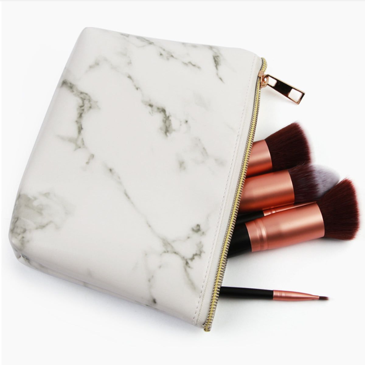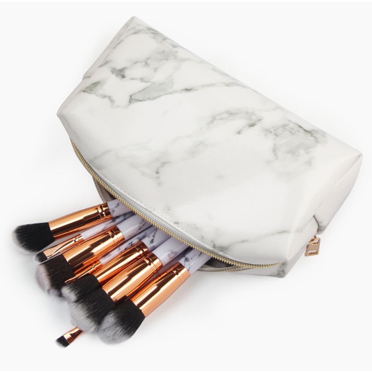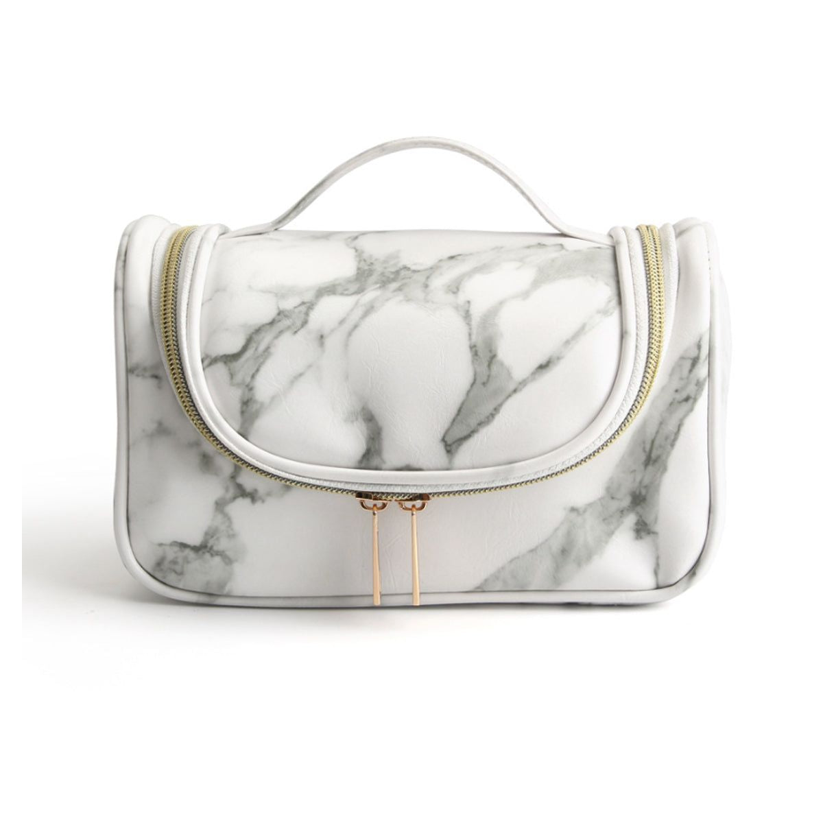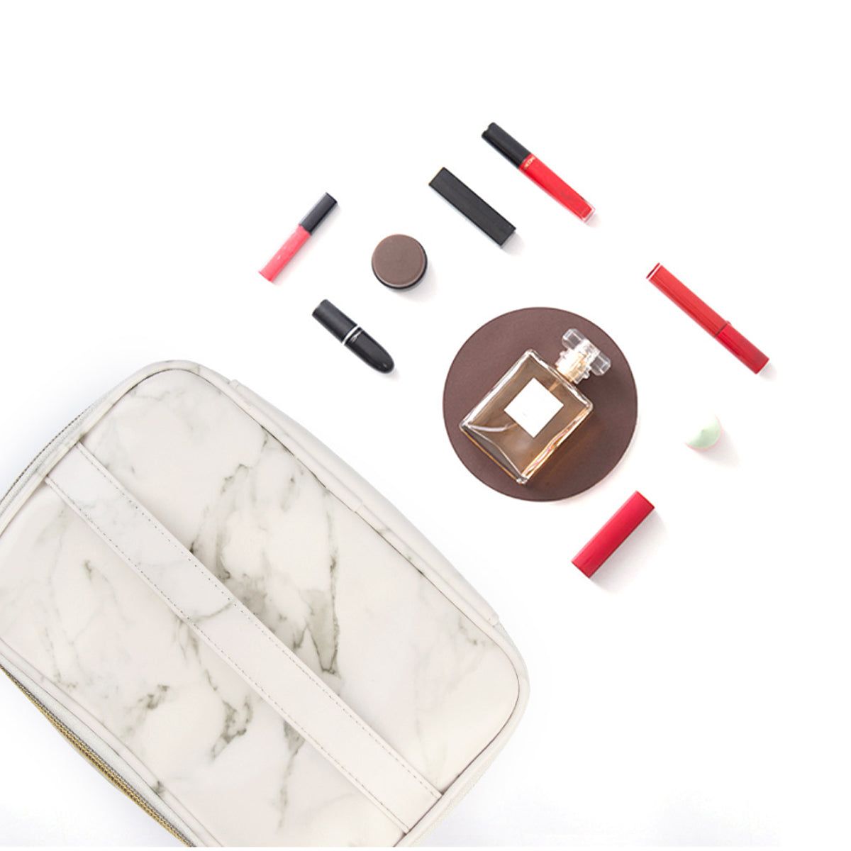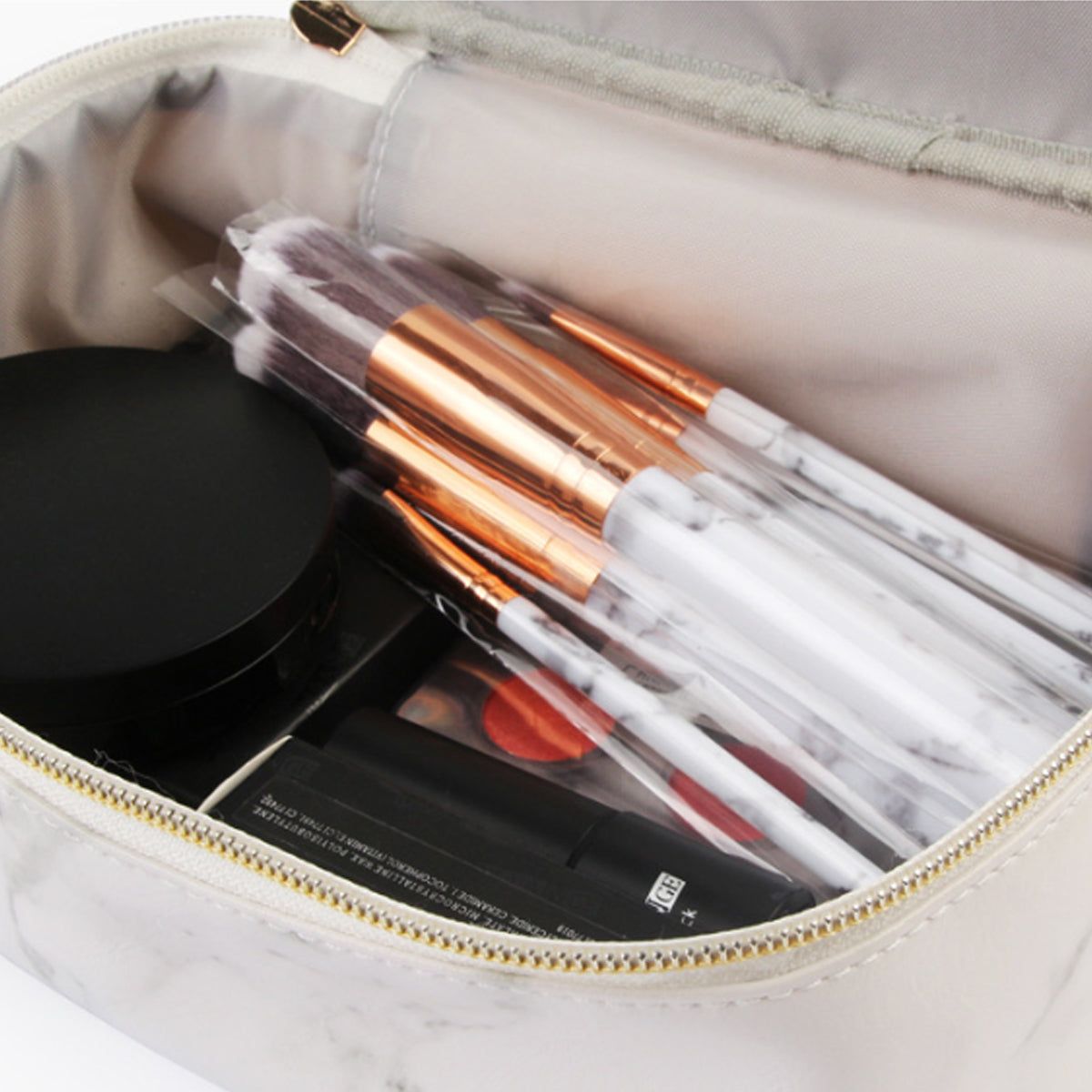 These 4 in 1 gorgeous and beautiful cosmetic bags are ideal for travel and for everyday use. They feature a chic and marvelous marble look created in waterproof high-quality vegan leather with a built-in handle and a gold zipper. These pretty and elegant bags are not just for women; they are practical and convenient enough for men as well; as they can also be used to store a shaving kit and electronics while on the go. They are made of waterproof material; that cleans easily without any damage. They also come with the softest and luxurious makeup brushes that have good-looking marble handles.