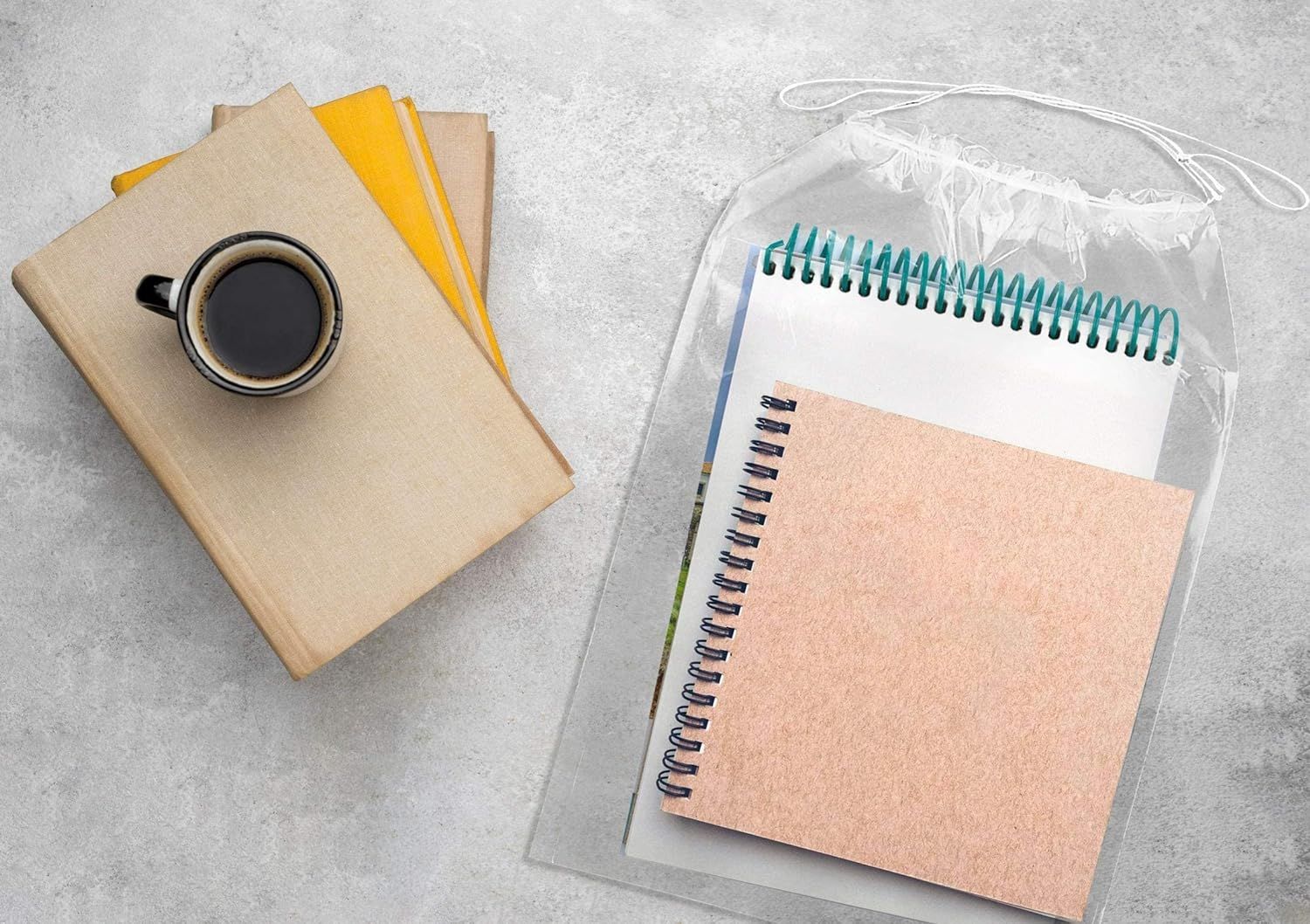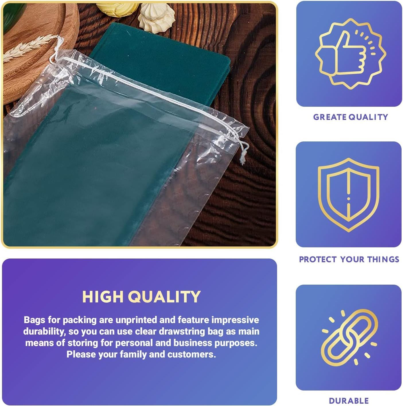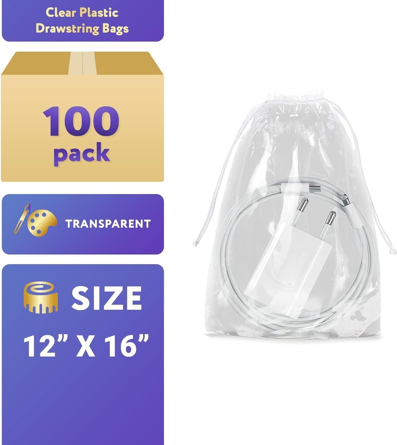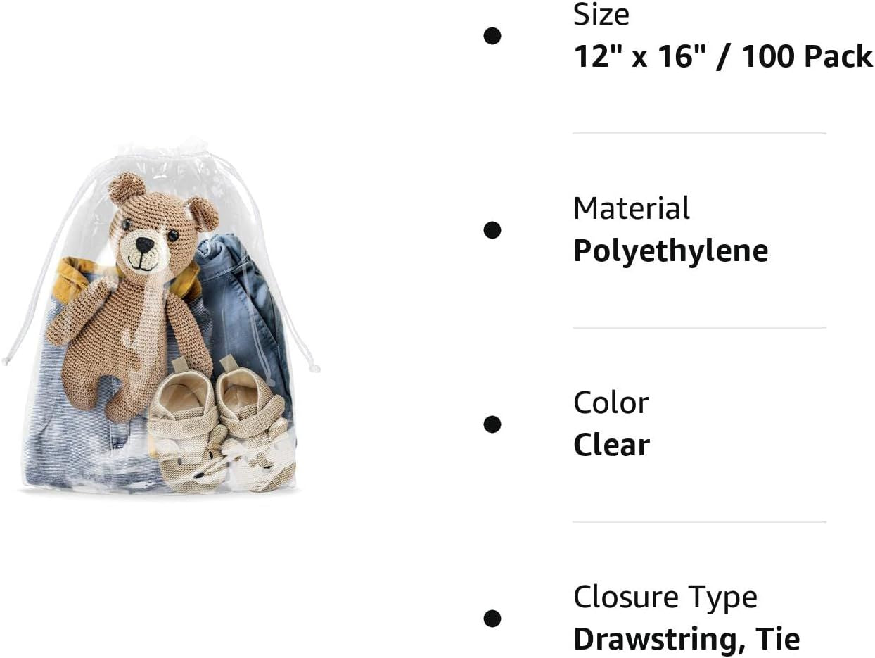 Clear Plastic Drawstring Bags 12" x 16" Pack of 100 Clear Bags for Gifts 2 Mil Polyethylene Drawstring Gift Bags; Water-Resistant Plastic Shoe Bags 12x16 for Travel with Double Cotton Drawstrings