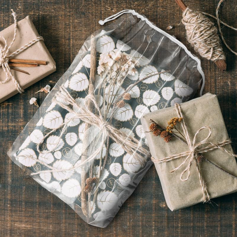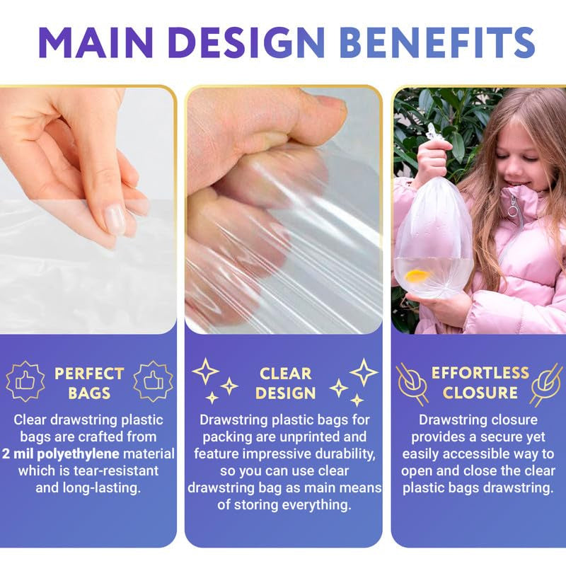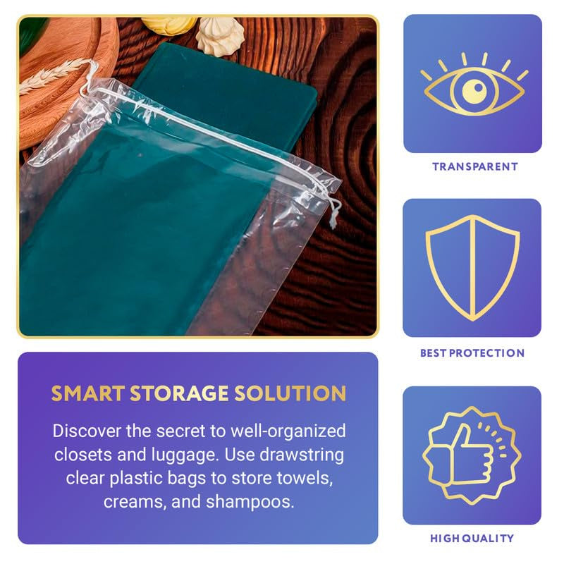 1.Pack of 50 clear drawstring bags, 9 x 12 inches. Transform your travel experience with plastic drawstring bags that effortlessly keep cosmetics separate from clothes, ensuring a neat and clean suitcase every time.