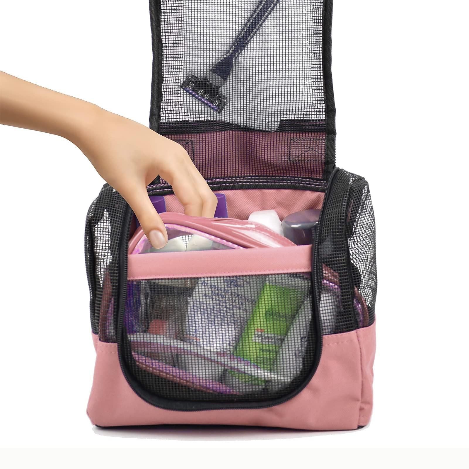 Portable Hanging Shower Caddy Organizer with 1 Free Toiletries Case Quick Dry Mesh Shower Caddy Tote Bag Included 1 Metal Hook Perfect for Dorm Camp Travel Gym Pink